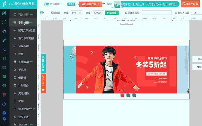 六月设计宝,无缝二级页,吸顶电梯楼层,铺货模块,实现二级页丰富动态效果组合。